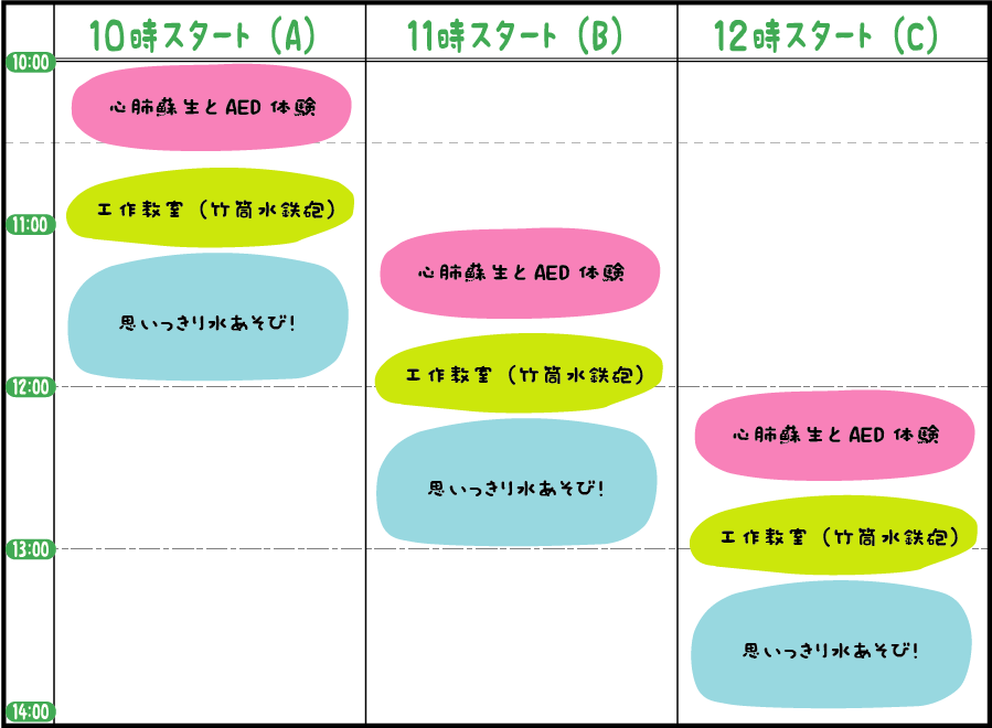 夏休みの前に心肺蘇生法やAED講習を受けておくと、万一水難事故に遭遇した場合でも、慌てずに対処することがができるようになり、安心して夏休みを楽しむことが出来ます。