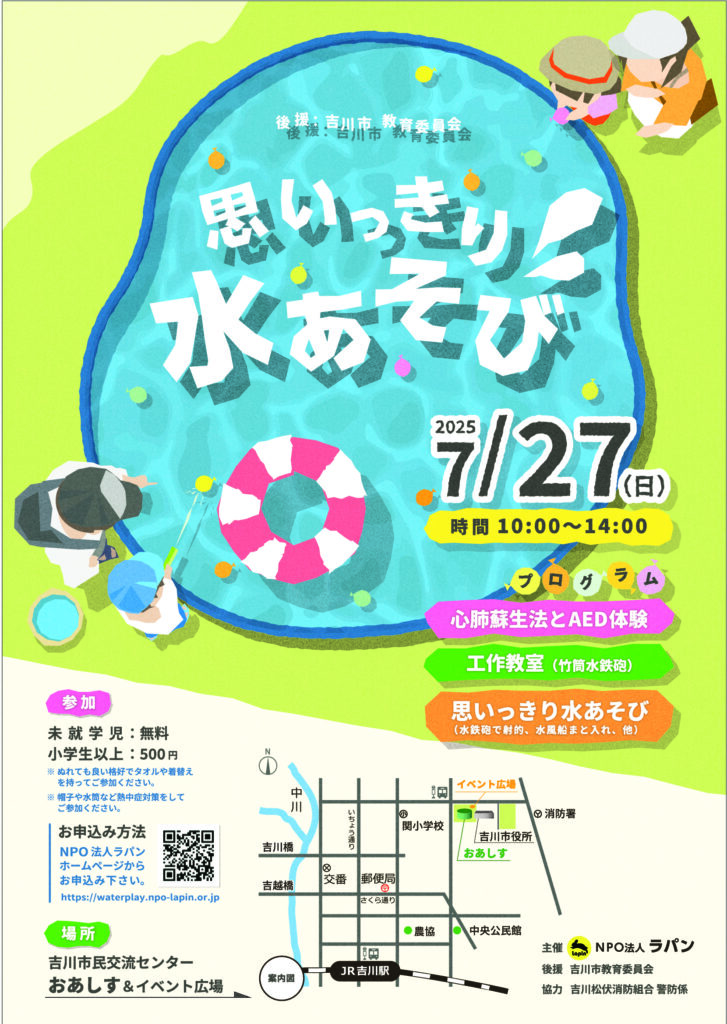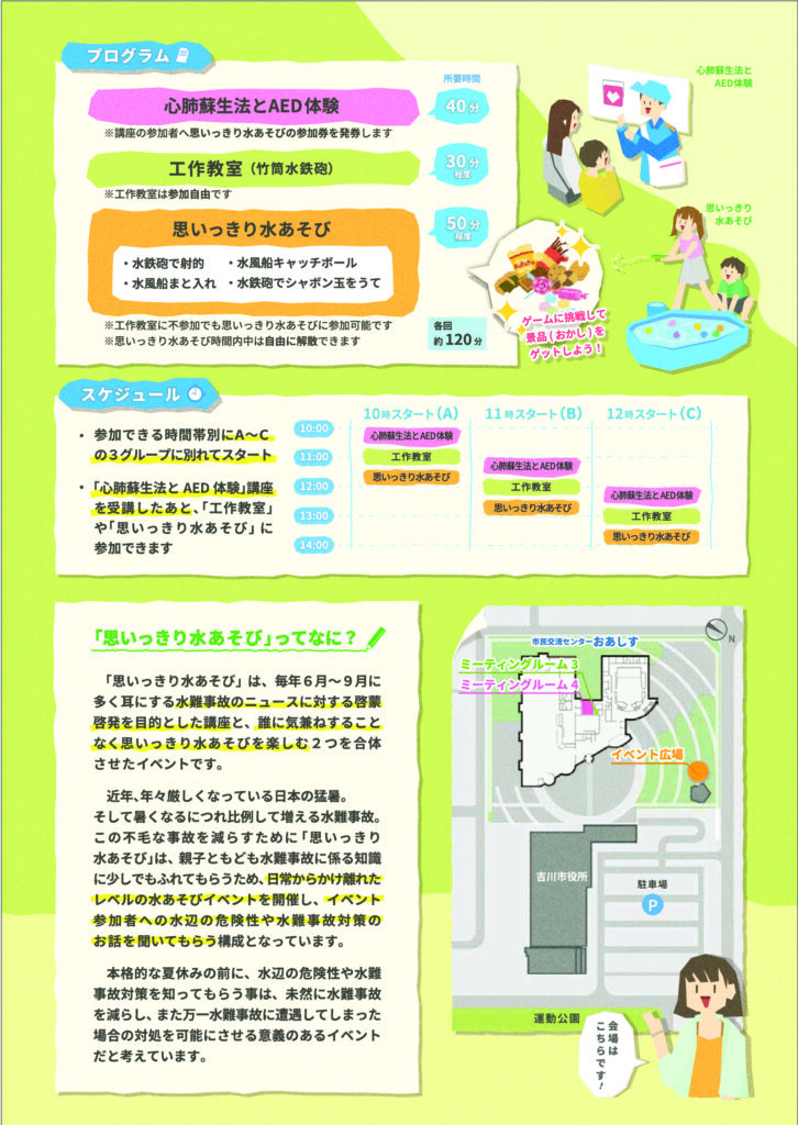 「思いっきり水遊び」は、親子ともども水難事故に係る知識に少しでも触れてもらうため、水辺の危険性や水難事故対策のお話を聞いてもらうことを目的としたイベントです。